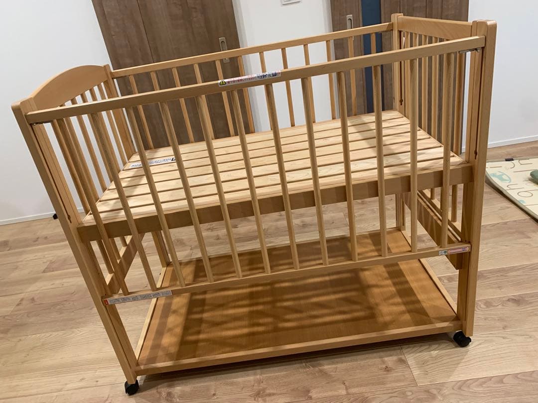 老舗メーカーの石塚家具のツースライドベビーベッドになります。\r向かって正面と右側の柵が上下にスライドします。\rスライドの高さは上段、中段、下段の3段階で下段でもベッドの高さをカバーしております。(現行品は下段まで落とすとベッド高さとほぼ同じになってしまいます)\r\rサイズ・・・約横128x奥行78x高さ114cm\r\r分解して保管しておりますのでその状態でお渡しとなります。\r組立方法はお渡しの際にお伝え致します。\r\r※コメントにてお渡しする日時を決めてからご購入お願い致します。\r\r直接のお引き取り可能です。\r直接の場合はご購入後に当方の住所が出ますがそちらでのお渡しではございません。近くのコンビニ等になりますので予めご了承ください。\r\r川崎市(中原区、高津区、宮前区)でしたら別途2000円にて配送可能です。\rそれ以外のご近隣の方はお問い合わせください。\r配送時間は基本的に日中(10時~16時)になります。その時間帯以外の配送希望の方はご相談下さい。\rその場合は敷地に入る寸前までになります。\r\r搬入及び設置は別途費用が掛かります。\r(段差や階段使用有り・エレベーターがない2階以上の場合は、事前にご確認をお願い致します)\r駐車スペースの件も同時にご連絡下さい。\r\rそれ以外の地域の方はご連絡下さい。\r\r・配送料が着払いとなっております。もちろん着払いでは発送できませんので予めご了承下さい。\r・購入後のキャンセル、返品はお受け出来ませんので予めご了承下さい。\r・中古ですので傷や汚れがございますので神経質の方はご遠慮下さい。備品等も写真が全てになりまして、たまに気付かない汚れや傷もございますので予めご了承下さい。\r・基本的に値引き、取置きもしておりませんのでご了承下さい。\r・お客様都合(イメージが異なるなど)による交換対応は致しかねます。\r・他のサイトにも出品しておりますので、ご確認の上購入お願い致します\r・ モニターや端末等のご利用環境及び撮影時季の日照角度により現物のお色と異なる場合がございますので予めご了承下さい。\r・私の個人的な物以外も出品しております。値引き対応や使用期間等の問い合わせを聞かれましても不明な物もありますので写真を見てご判断下さい。\r\r素材...天然木・無垢材\r\r種別···ベビーベッド